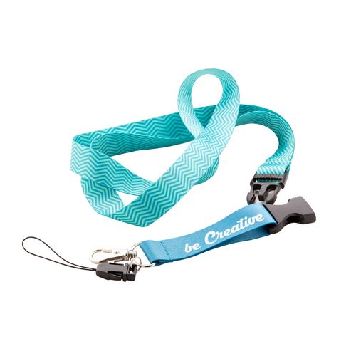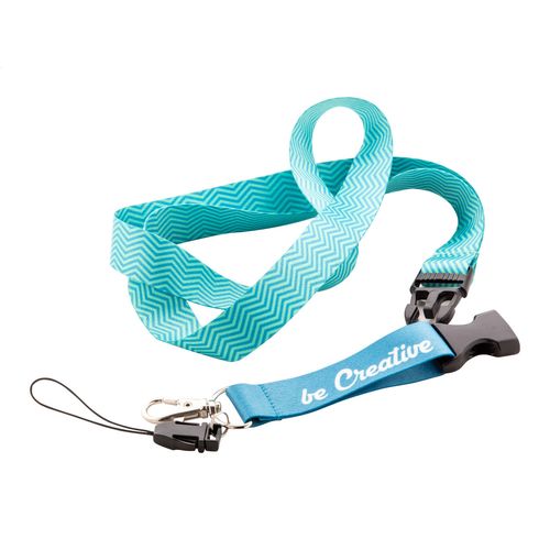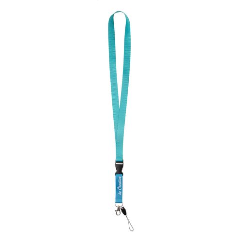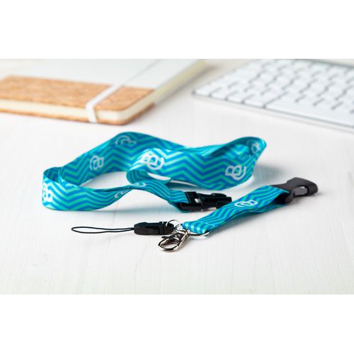 Custom made, polyester lanyard with detachable metal carabiner and mobile string. With sublimation printed graphics on both sides. MOQ: 100 pcs.