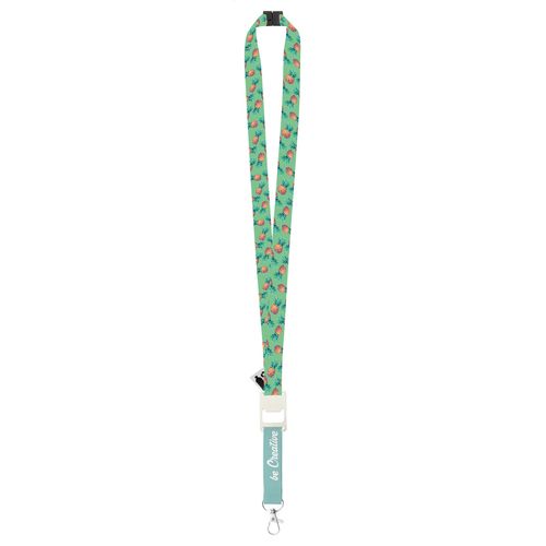 Custom made, RPET lanyard with metal carabiner, bottle opener and safety buckle. With sublimation printed graphics on both sides. MOQ: 100 pcs.
