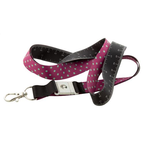 Custom made, RPET lanyard with 100 cm tape measure and metal carabiner wheat straw plastic buckle. With sublimation printed graphics on one side. MOQ: 100 pcs.