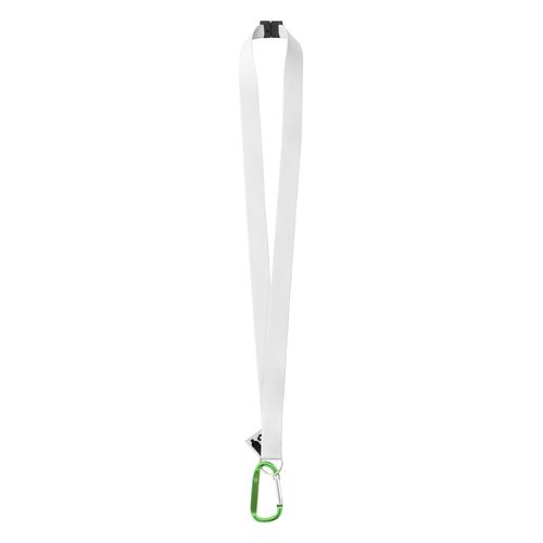 Custom made, RPET lanyard with large recycled aluminium carabiner and safety buckle. With sublimation printed graphics on both sides. MOQ: 100 pcs.
