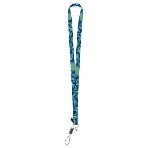 Custom made, 15 mm wide RPET lanyard with metal carabiner and mobile string. With sublimation printed graphics on both sides. MOQ: 100 pcs.