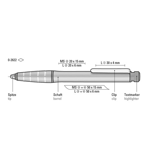 Metal twist ballpoint pen with aluminium housing and integrated yellow writing text marker in the barrel. The text marker can be twisted out of the barrel and used separately.