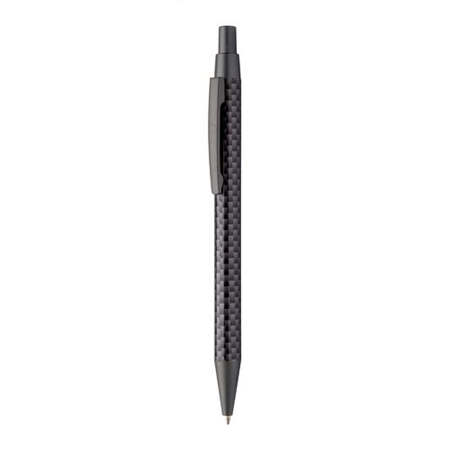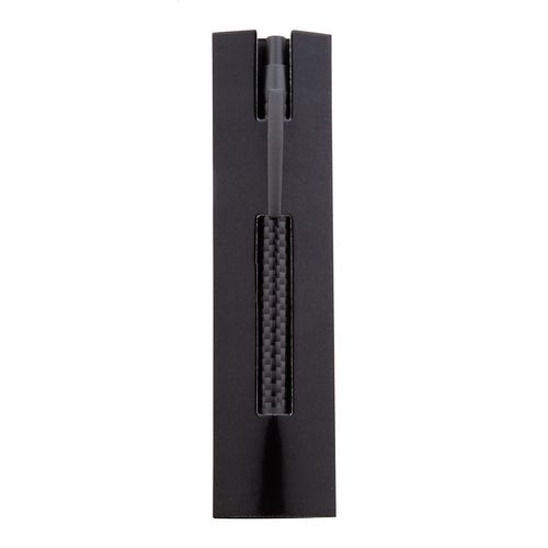 Metal ballpoint pen with carbon patterned barrel, in black paper sleeve. With blue refill.