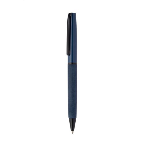 Elegant, metal twist ballpoint pen with PU leather covered barrel and black parts. In black gift box. With blue refill.