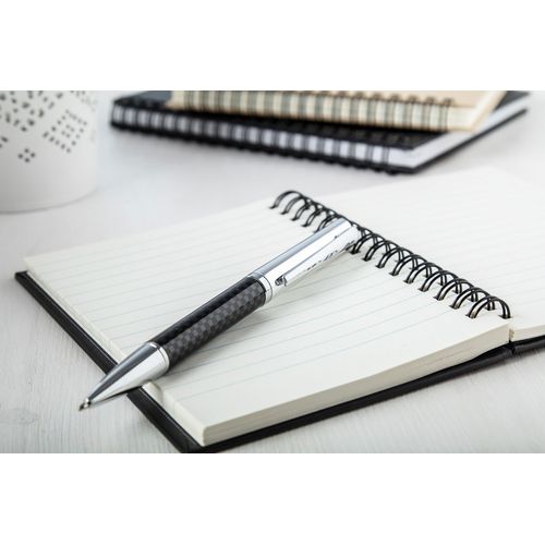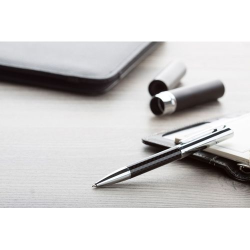 Metal ballpoint pen with carbon designed barrel and with blue refill.