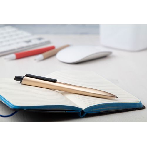 Plastic ballpoint pen with black parts and matte metallic finish. With blue refill.