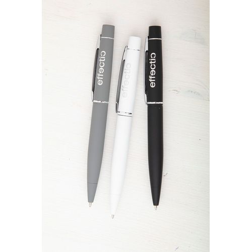 Metal twist ballpoint pen with rubberized finish and blue refill. With special coating for mirror laser engraving.