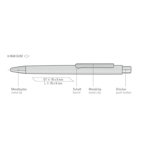 Metal retractable ballpoint pen with elliptical softtouch housing. Metal clip, metal tip and elliptical push-button gun metallic.