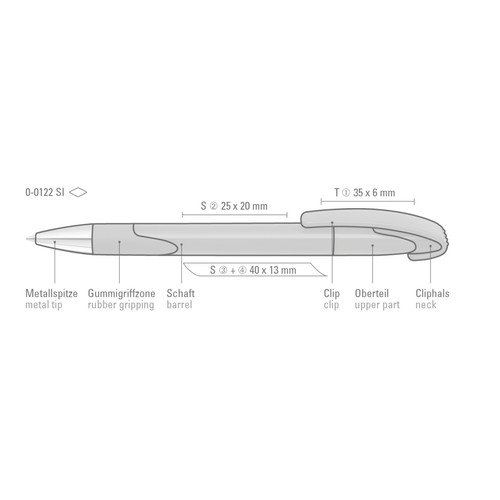 Retractable ballpoint pen with opaque glossy housing, rubber grip zone and heavy metal tip chrome plated.