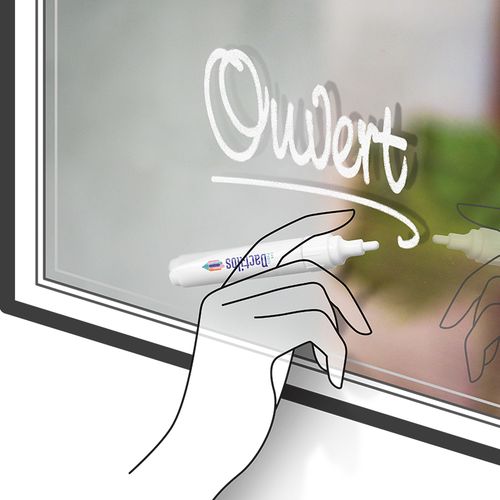 For your window decorations, your dish of the day on a slate or during a whiteboard work session, this water-resistant yet erasable magic marker will be your ideal marker. Usable on all media, it is still advised to do a wipe test before use. Branding on the body in 1 Colour or Quadri-Digital.