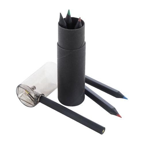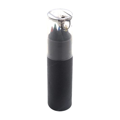 6 pc black wood coloured pencil set in round black cardboard case with plastic sharpener.