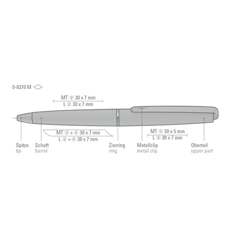 Metal twist ballpoint pen with soft twist mechanism, matt lacquered housing. Long, flexible metal clip, ring and tip glossy black.