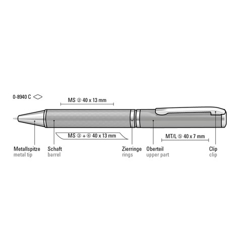 Carbon fibre metal twist ballpoint pen with two recessed silver rings and cap in black. Metal fittings chrome plated.