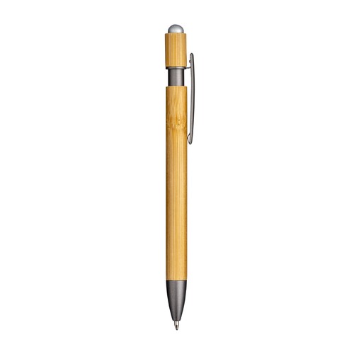 Bamboo and metal click pen. Burnished details and touch screen grommet
