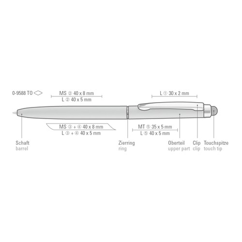 Metal twist ballpoint pen with matt coloured or glossy white housing and silver glossy fittings. Black rubber ball with integrated touch screen control.