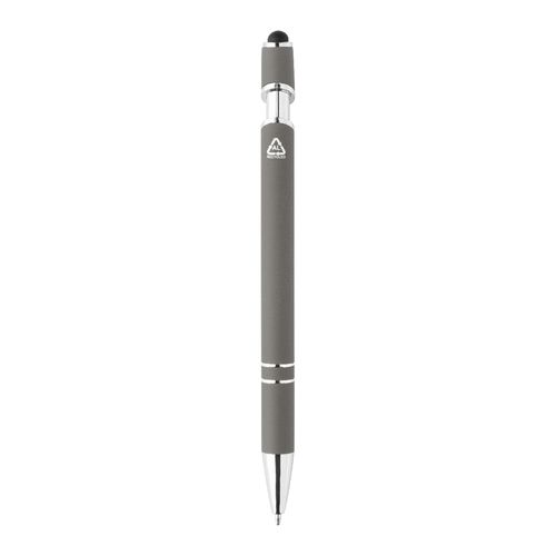 Recycled aluminium ballpoint and touchscreen pen with rubberized body and chrome details. With blue refill.