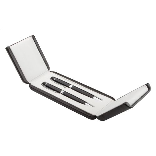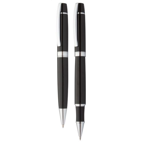 Elegant, metal ballpoint pen and roller pen set, with shiny chrome parts. In PU leather gift box, with blue refill. André Philippe brand product.