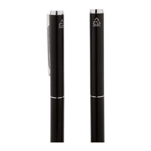 Recycled aluminium pen set with roller and ballpoint pen in black paper gift box. With blue refill.