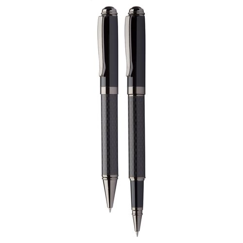 Elegant, metal ballpoint and roller pen set with pattern barrel. In black gift box, with blue refill. André Philippe brand product.