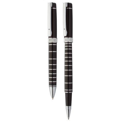Elegant, aluminium pen set with ballpoint pen and roller pen. With shiny barrel and chrome rings. In black gift box with blue refill. André Philippe brand product.