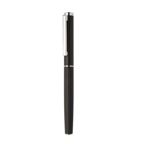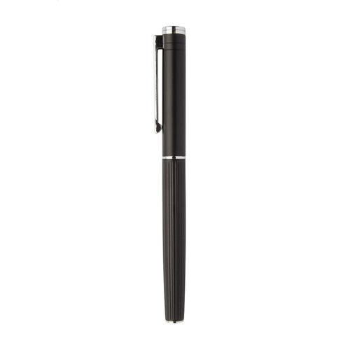 Elegant, aluminium ballpoint pen and roller pen set with stripe textured barrel. In black gift box, with blue refill.