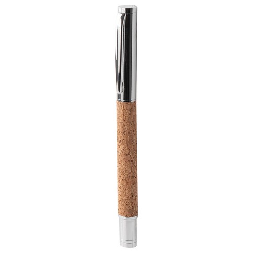Cork box set with pen and roller, both with metal body and cork. One ball pen with blue ink and one roller with cap and black ink.
