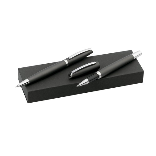 Elegant set of ball pen with twist mechanism and roller with hood in sober design. Aluminum body with silver colored accessories. Presented in an individual cardboard box with black cover. Pen with jumbo cartridge. In blue ink.