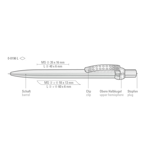 Metal retractable ballpoint pen with chrome and lacquered barrel. Upper hemisphere and plug in transparent colour. Metal clip, push-button and lower hemisphere chrome plated.