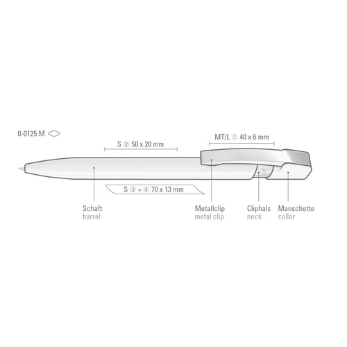 Retractable ballpoint pen with opaque glossy housing in white or black and transparent glossy coloured collar, flexible metal clip chrome plated.