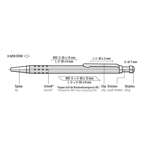 Slim metal retractable ballpoint pen with lacquered housing and perforated grip zone. Metal fittings chrome plated and individual designable doming.
