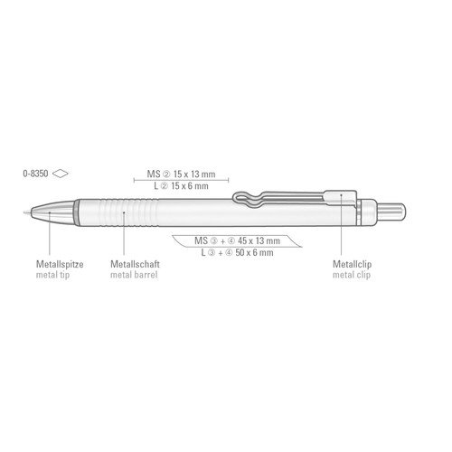 Metal retractable ballpoint pen with matt lacquered aluminium barrel and integrated grip zone. Metal clip and fittings chrome plated. Ring black.