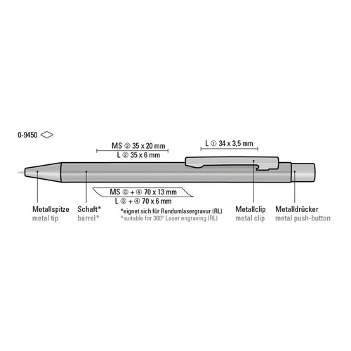 Metal retractable ballpoint pen with glossy housing. Metal clip, metal tip and push-button GUN metallic.