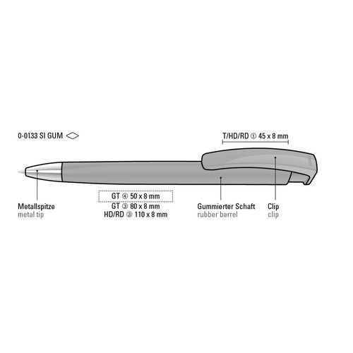 Retractable ballpoint pen with softtouch triangular housing, opaque glossy clip and heavy metal tip chrome plated.