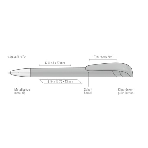 Retractable ballpoint pen with opaque glossy housing in black or white, wide curved clip button and heavy metal tip chrome plated.