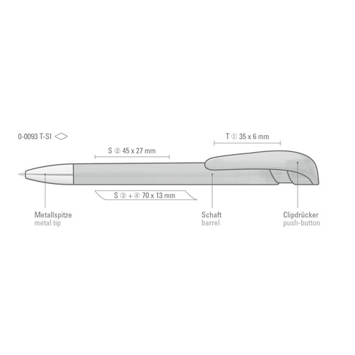 Retractable ballpoint pen with transparent glossy housing, wide curved clip button and heavy metal tip chrome plated.
