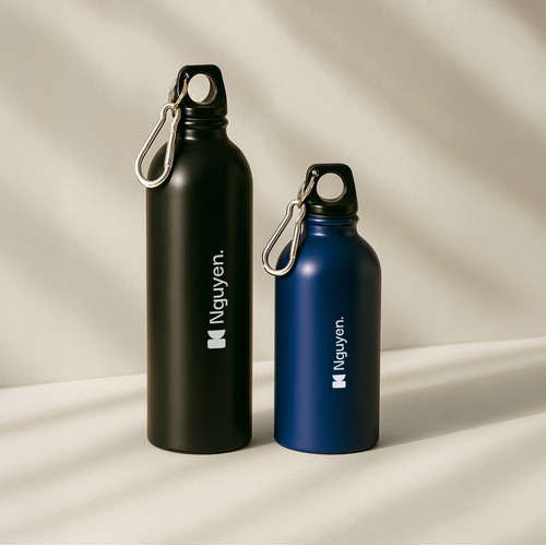 Bottle of 750 ml made of recycled steel and with a carabiner, ideal for mountain, hiking, or everyday use.