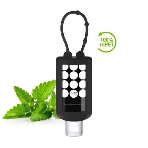 50 ml bottle and flip top (randomly aligned) in white. Silicone cover and loop in black. Refillable.
