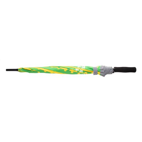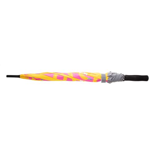 Custom made, 8 panel automatic umbrella with reflective trimming, metal shaft, fibreglass ribs and EVA handle. 190T RPET pongee. With distinctive RPET label and sublimation printed graphics on all panels. MOQ: 50 pcs. For promotional use only, the product does not qualify as a Personal Protective Equipment.
