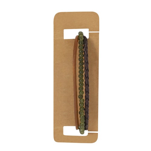 Bracelet made of leather, designed with the combination of three cords: light brown leather with a smooth finish, a central cord with green glass beads, and a third cord of braided brown leather. With an adjustable closure made of soft waxed cotton and a casual. Presented in a kraft cardboard with a smooth surface for branding.